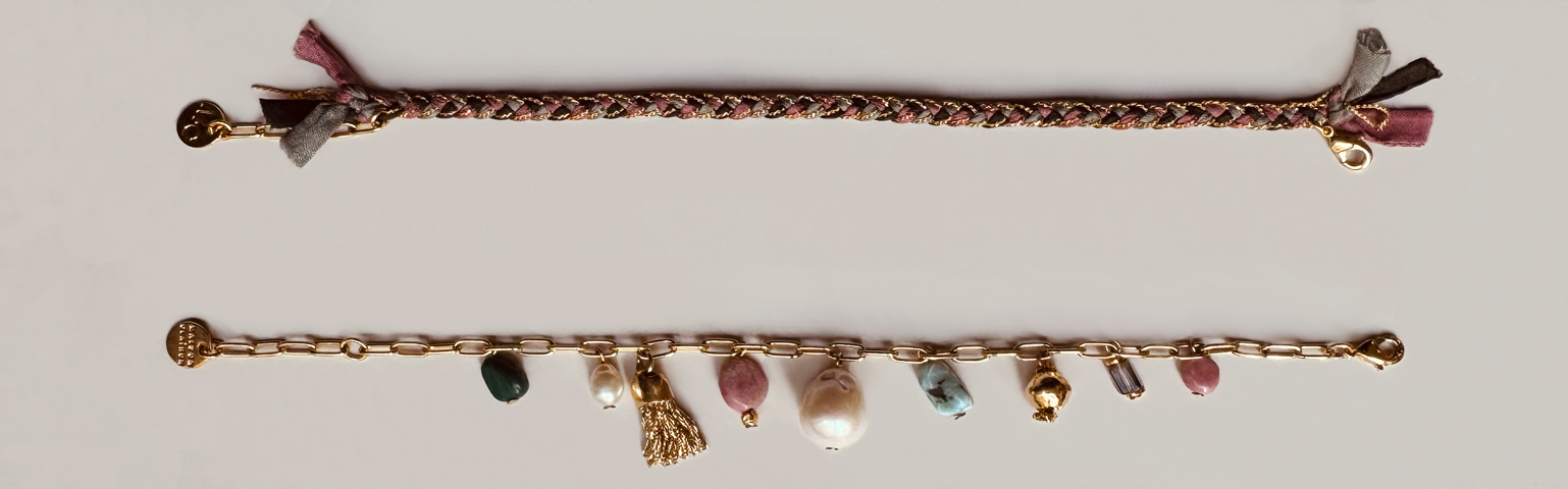 Jewelry with a crossbred allure, created and handcrafted by designer Claire Charlon in her workshop in Villeneuve les Avignon. A collection where everything can be slipped on and off with finesse and delicacy, in a contemporary bohemian, chic and rock spirit for the modern woman who loves life. A journey of 9 stops inspired by the 4 elements – water, air, earth and fire – where shells, feathers, stones, wooden beads and colorful silk ribbons are warmly combined with different gildings.