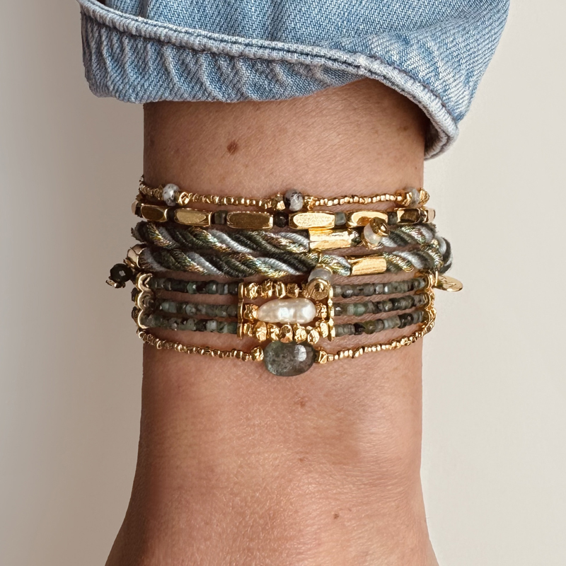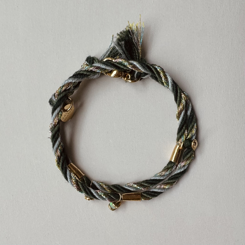 Double bracelet in multicolored twisted cotton with agate beads and 24-carat gold-plated pearls.