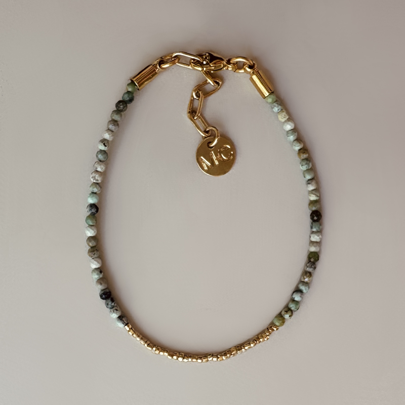 Bracelet with natural Variscite mini pearls and 24-carat gold-plated pearls, 1 micron.