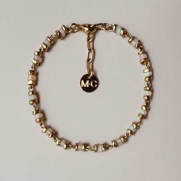 1 micron, 24-carat gold-plated pearl bracelet adorned with Ethiopian opal beads.