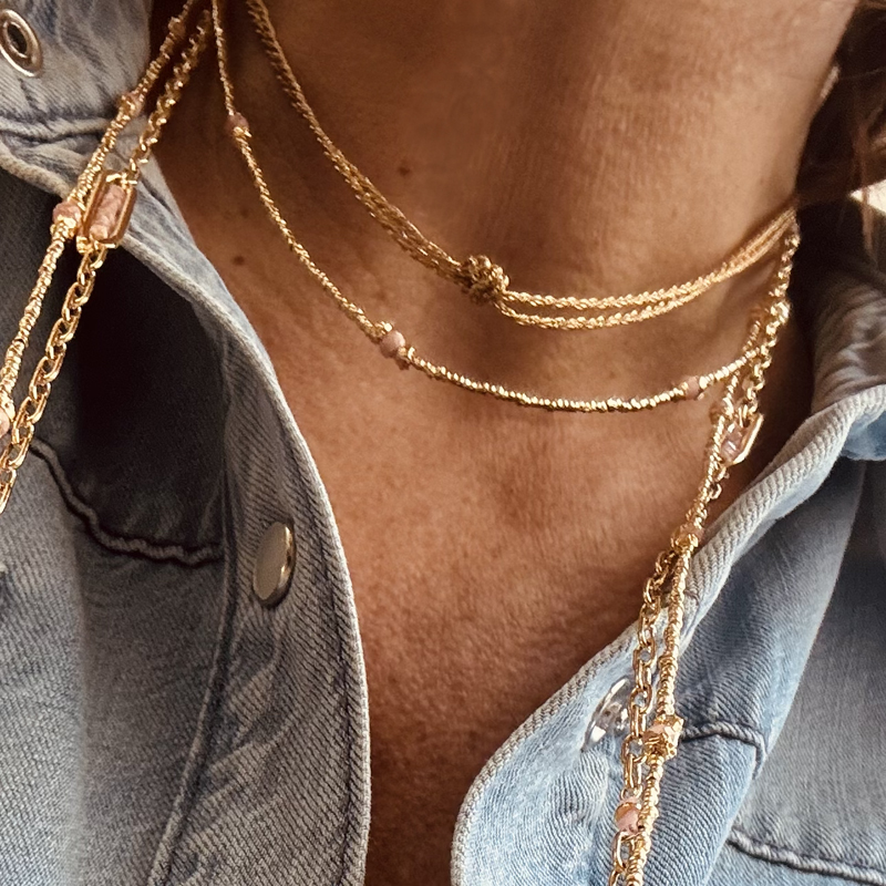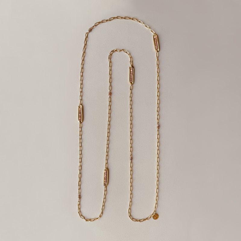 Long chain gilded with 24-carat, 1 micron fine gold, adorned with pink rodochrosite beads.