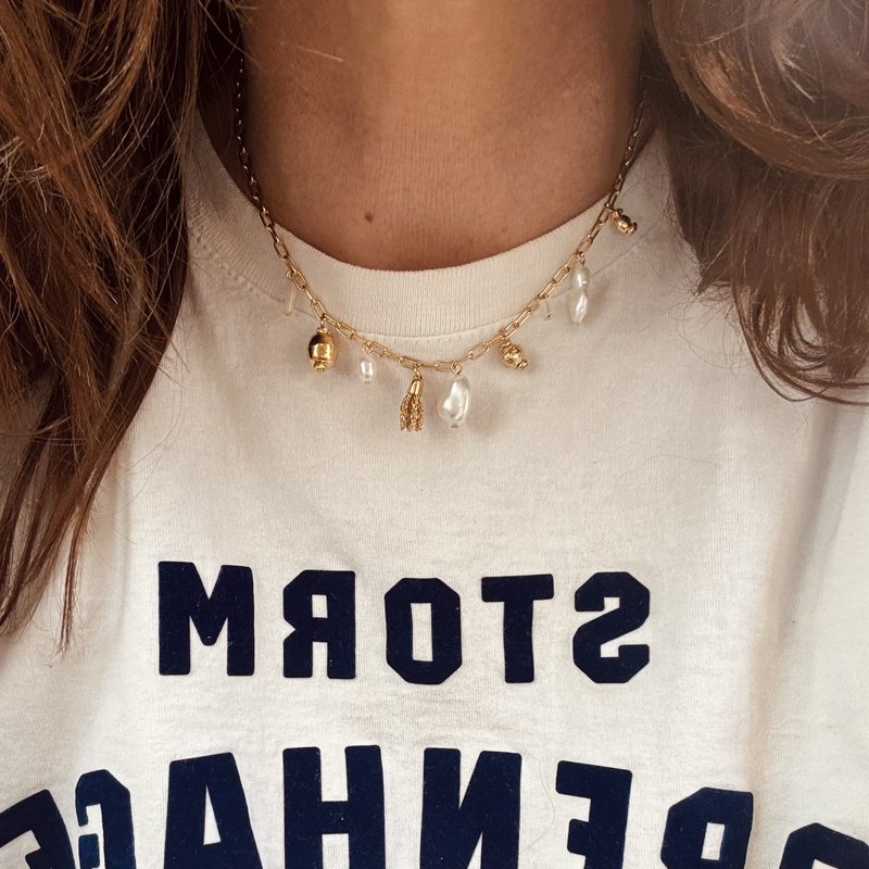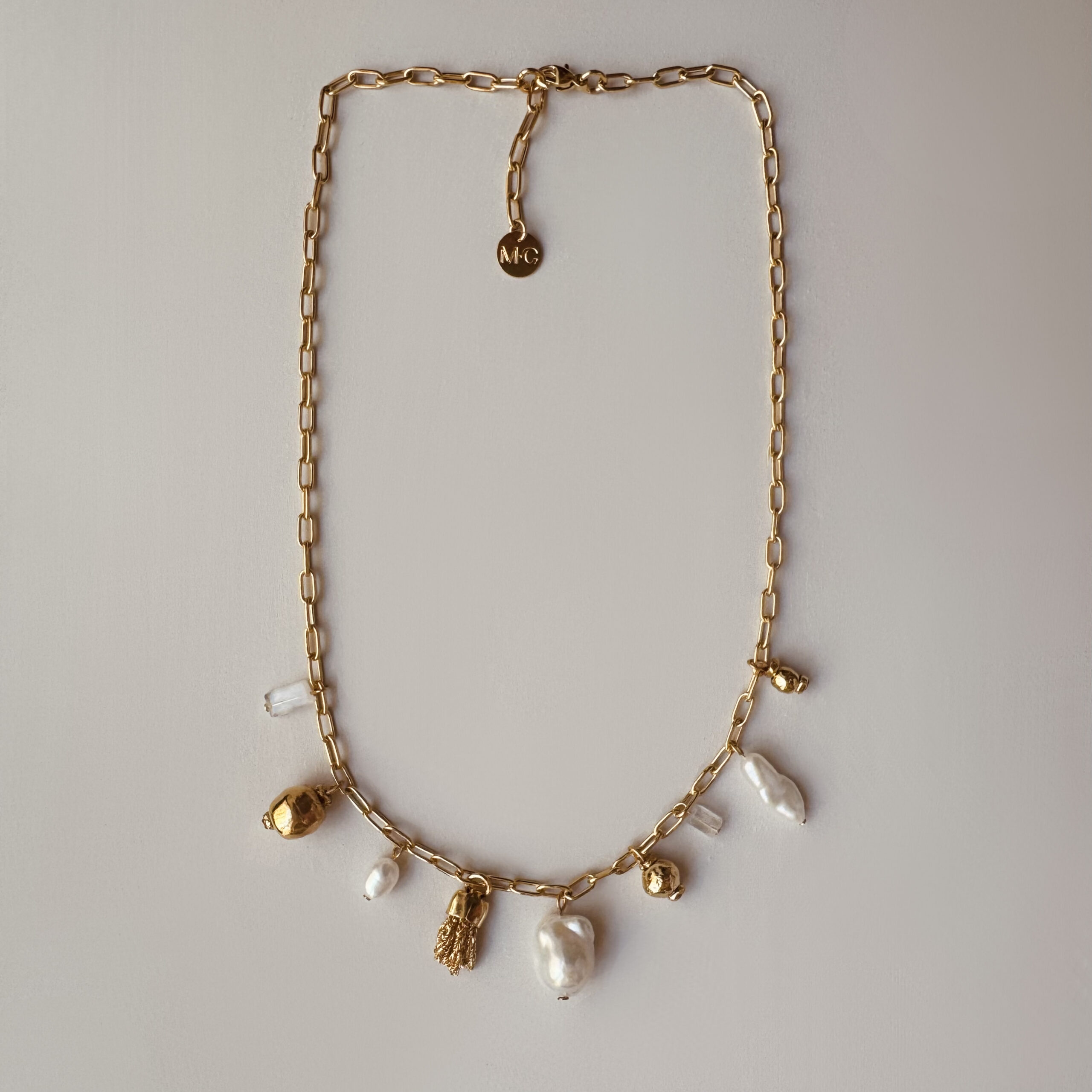 Necklace Charm of moonstone pearls, freshwater pearls, gilded with 24-carat fine gold, 1 micron.