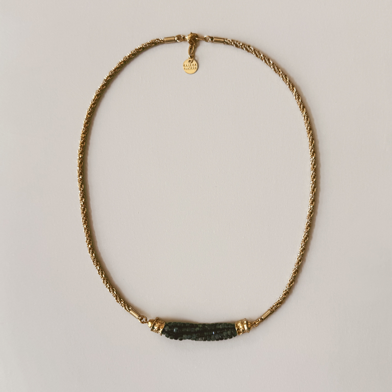 Twisted chain necklace gilded with 24-carat, 1-micron gold, adorned with Emerald pearls.