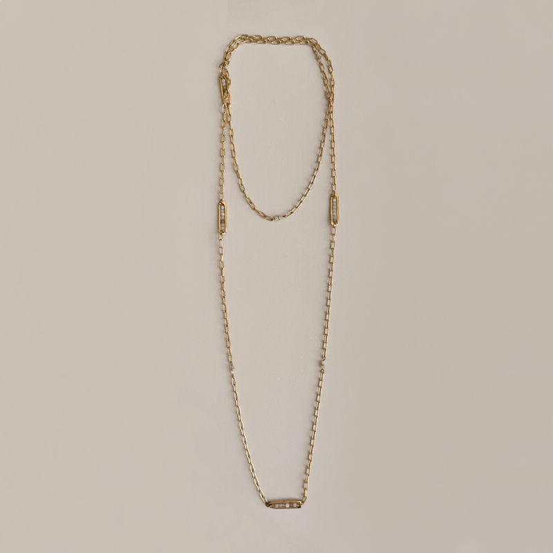 Long necklace made of a 1 micron, 24-carat gold-plated chain adorned with moonstone beads.