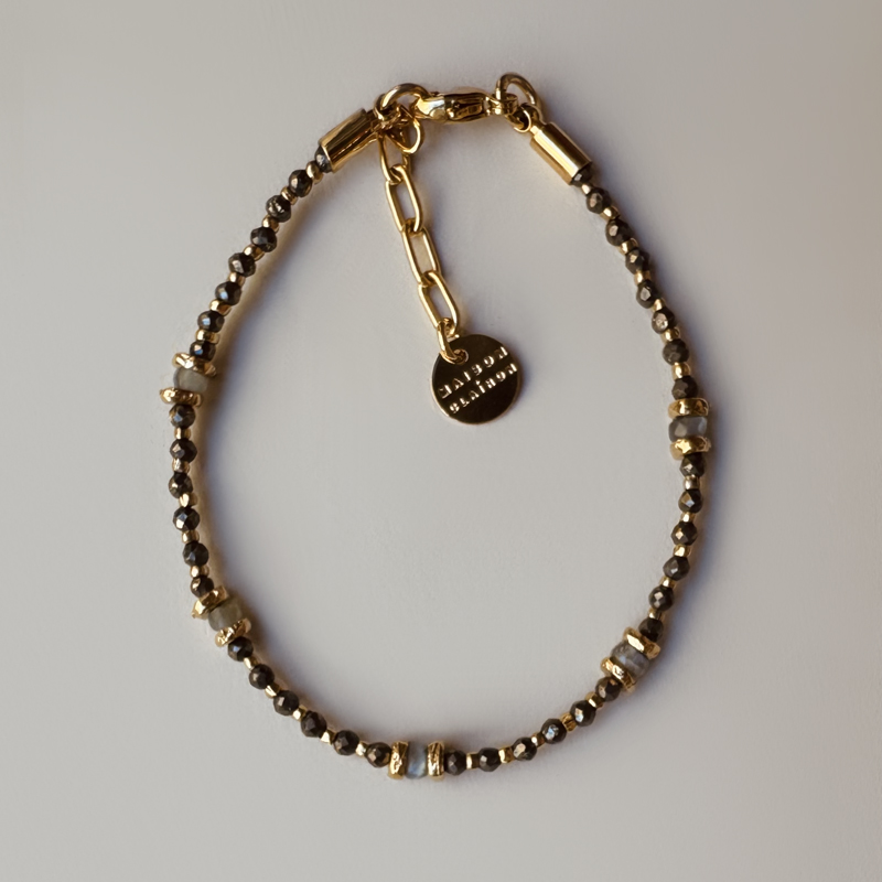 Bracelet with natural Pyrite stones and 24-carat gold-plated pearls, 1 micron.