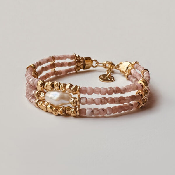 3-row bracelet, Rodochrosite pearls, gilded with 24-carat, 1-micron fine gold.
