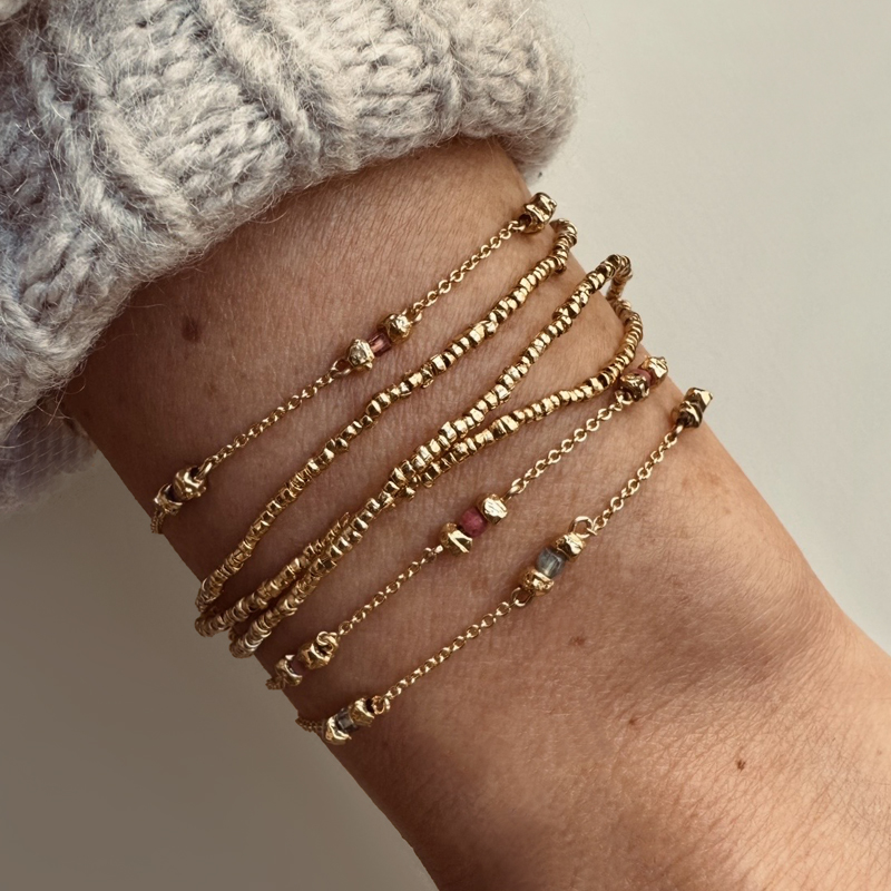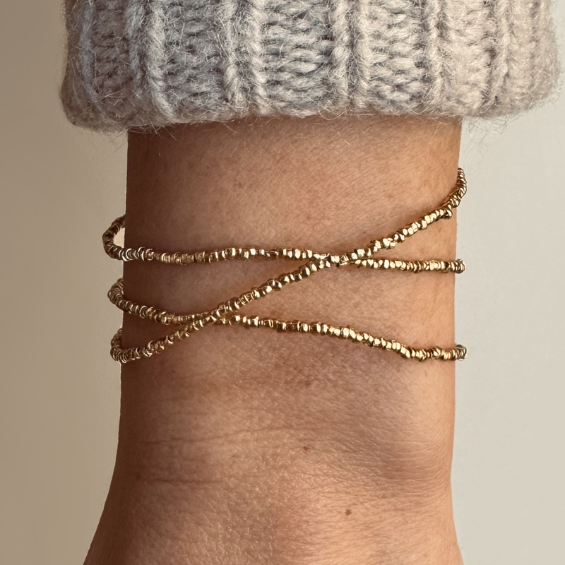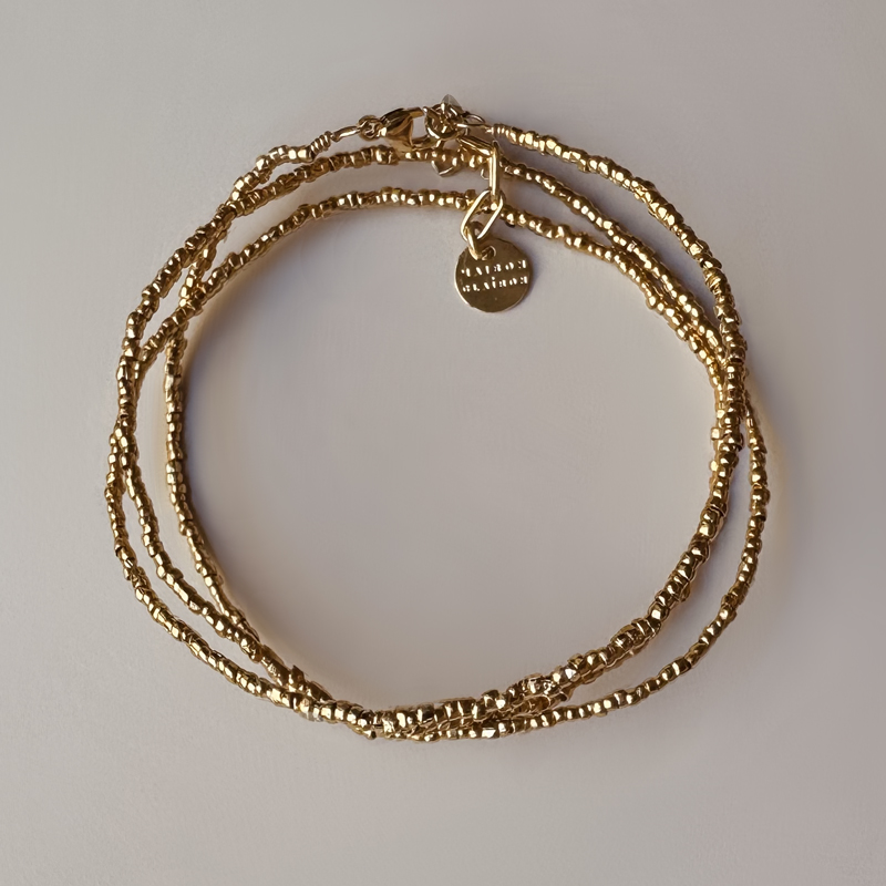 Bracelet 3 Tours en mini perles dorées à l’or fin 24 carats, 1 micron, monté sur fil de Cuivre Doré à l’or fin 24 carats.