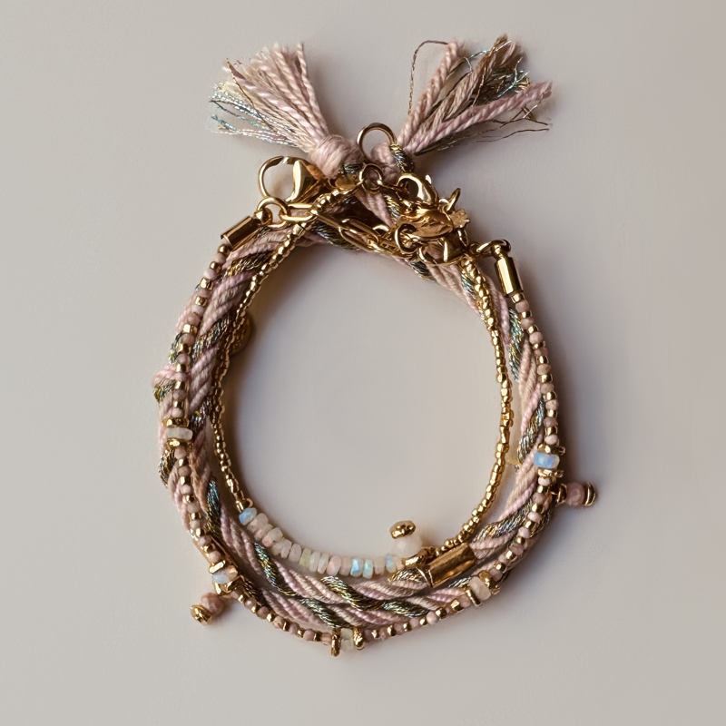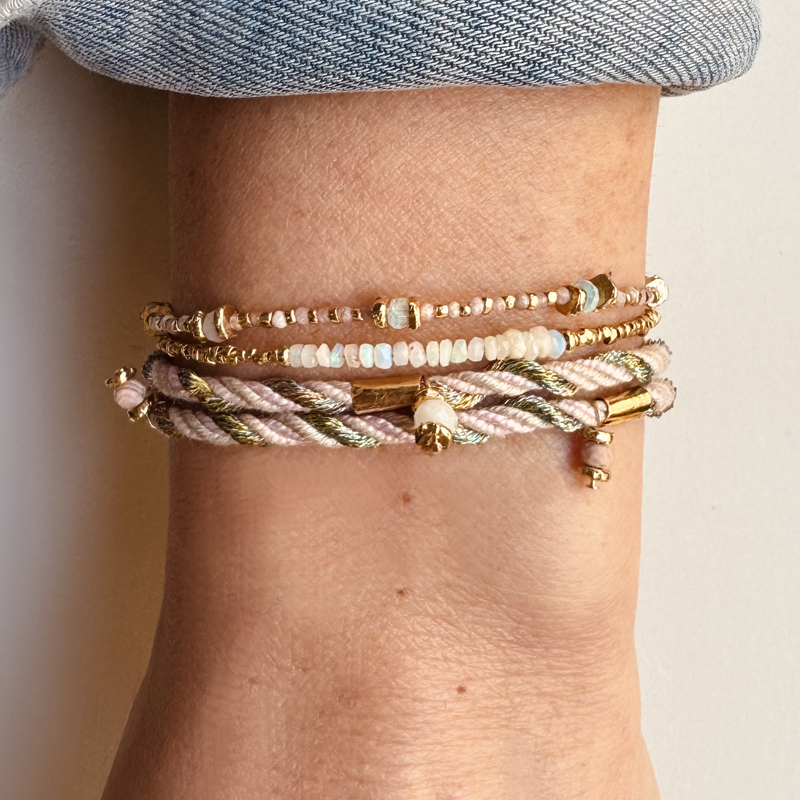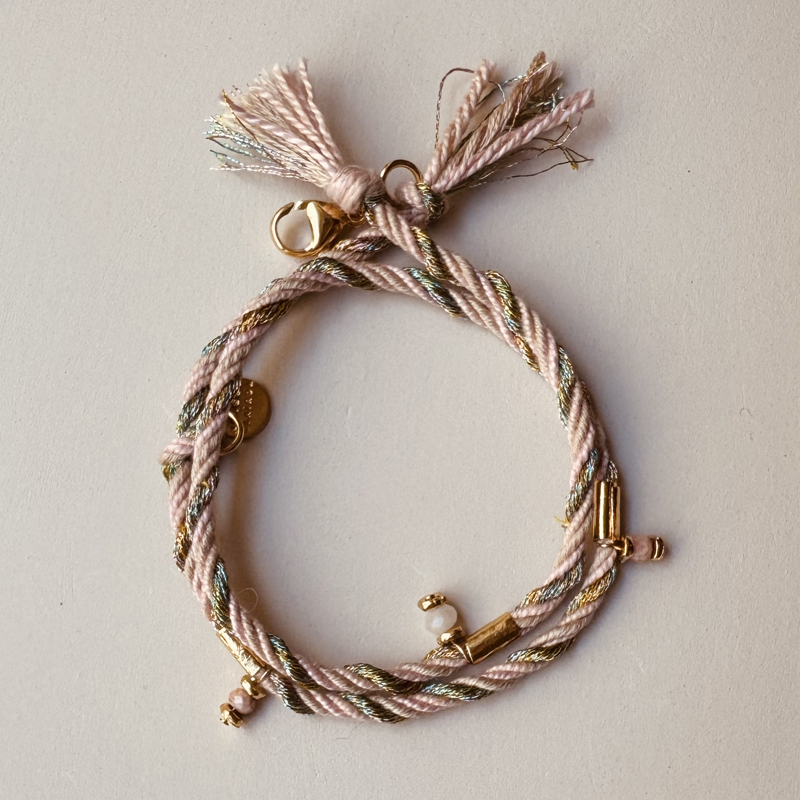 Bracelet Double en coton Torsadé multicolore muni de perles d’Agates et perles dorées à l’or fin 24 carats.