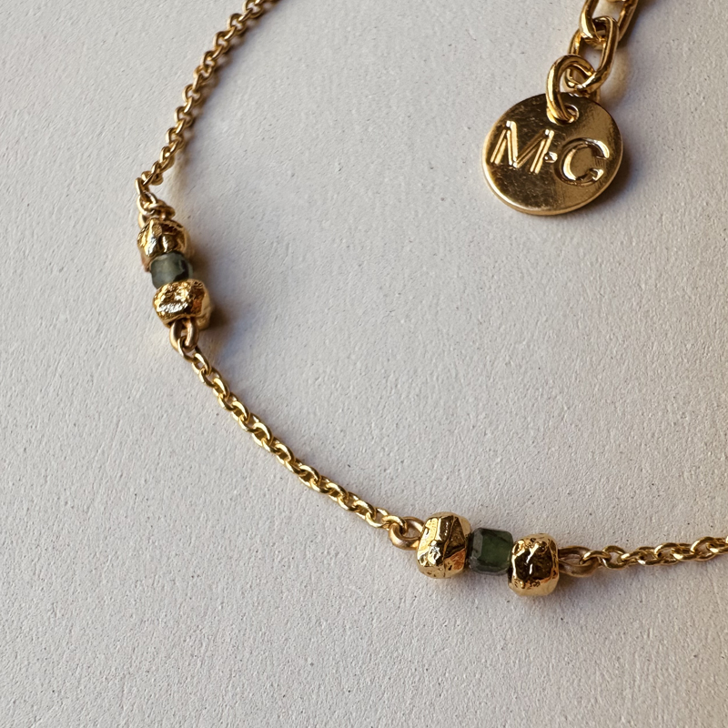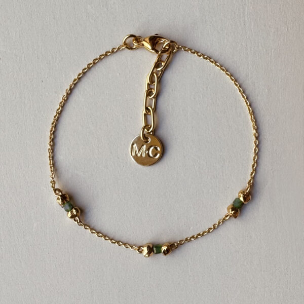 Bracelet en chaine fine dorée à l’or fin 24 carats, 1 micron, orné de perles d’Emeraude.