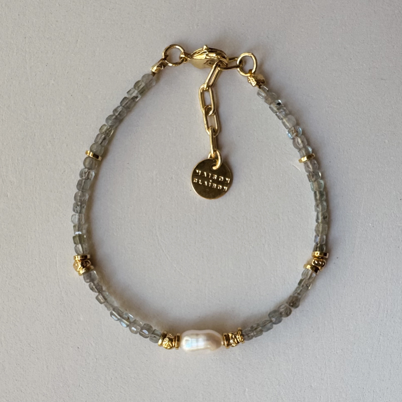 Bracelet en perles d4apatite ciel et perle d’eau douce, dorure à l’or fin 24 carats, 1 micron.