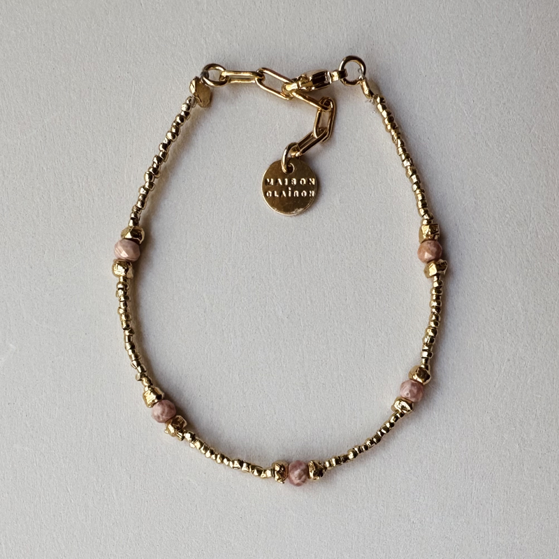 Bracelet orné de Rodochrosites et petites perles dorées à l’or fin 24 carats, 1 micron.