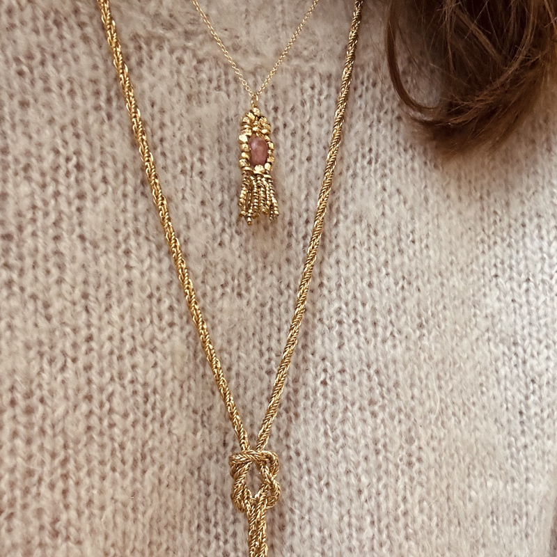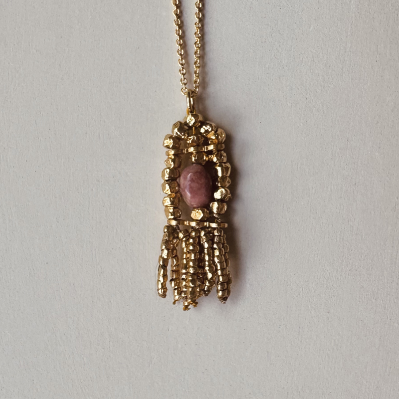 Collier en chaine et perles Dorées à l’or fin 24 carats, 1 micron, orné d’une pierre de Rhodonite.