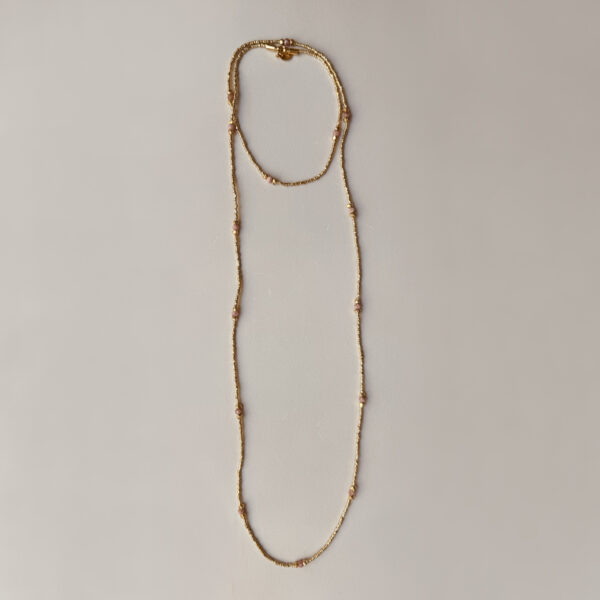 Sautoir doré à l’or fin 24 carats, 1 micron, orné de 11 Rodochrosite rose.