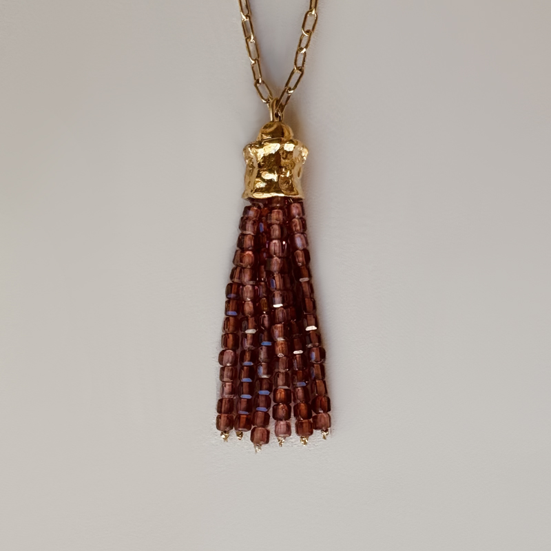 Sautoir doré à l’or fin 24 carats, 1 micron, orné d’un pompom en Perles de Grenat couleur raisin.